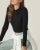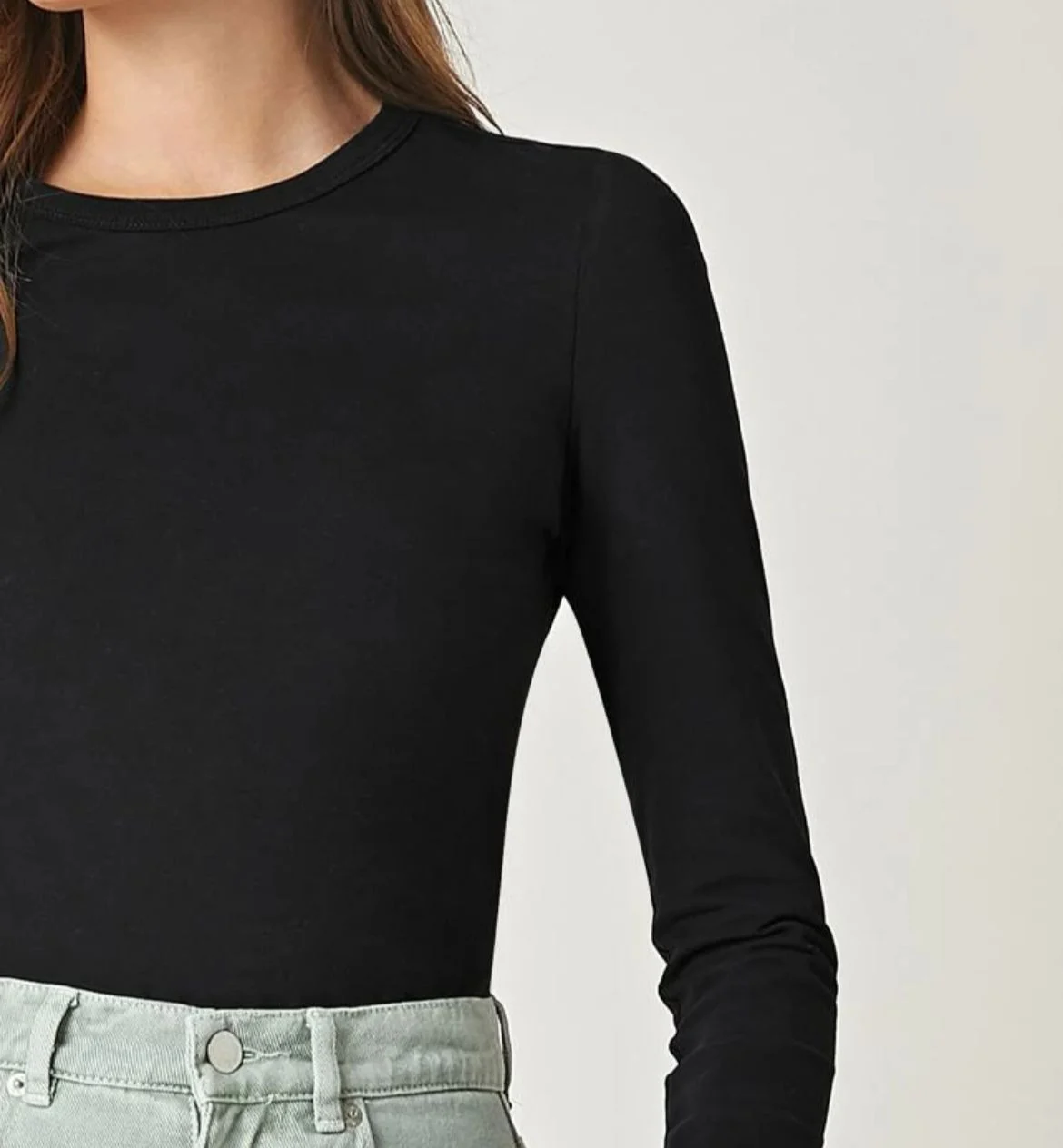 Detalle de modelo: Camiseta LARGA de mangas largas con corte basico al cuerpo y cuello redondo.