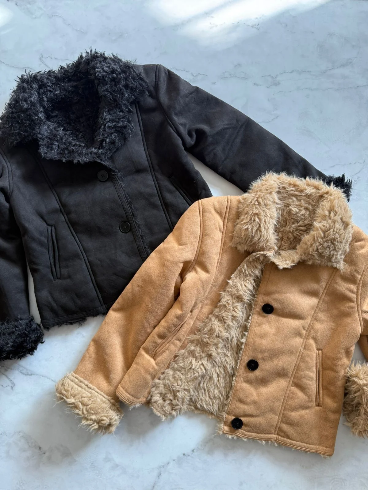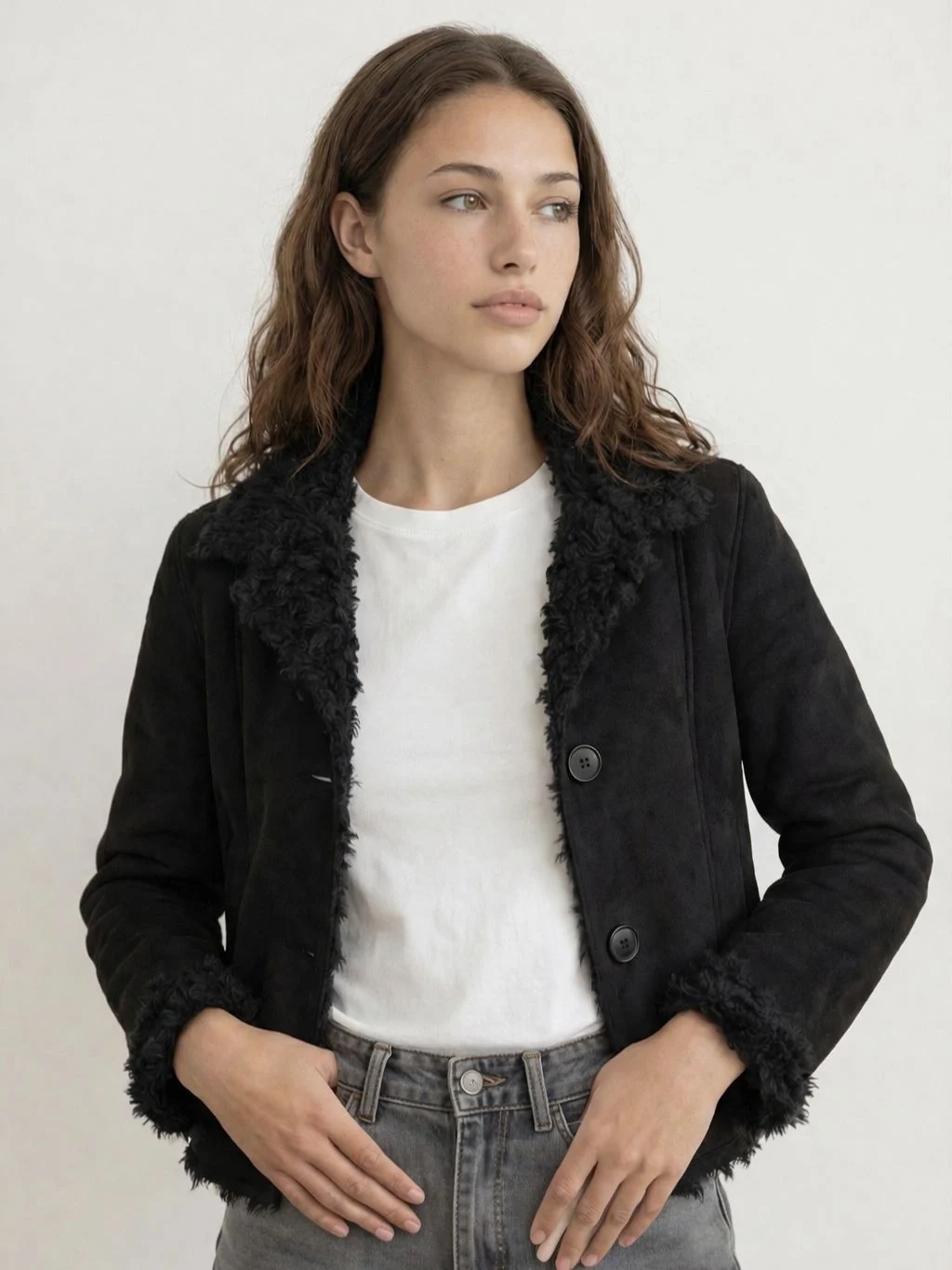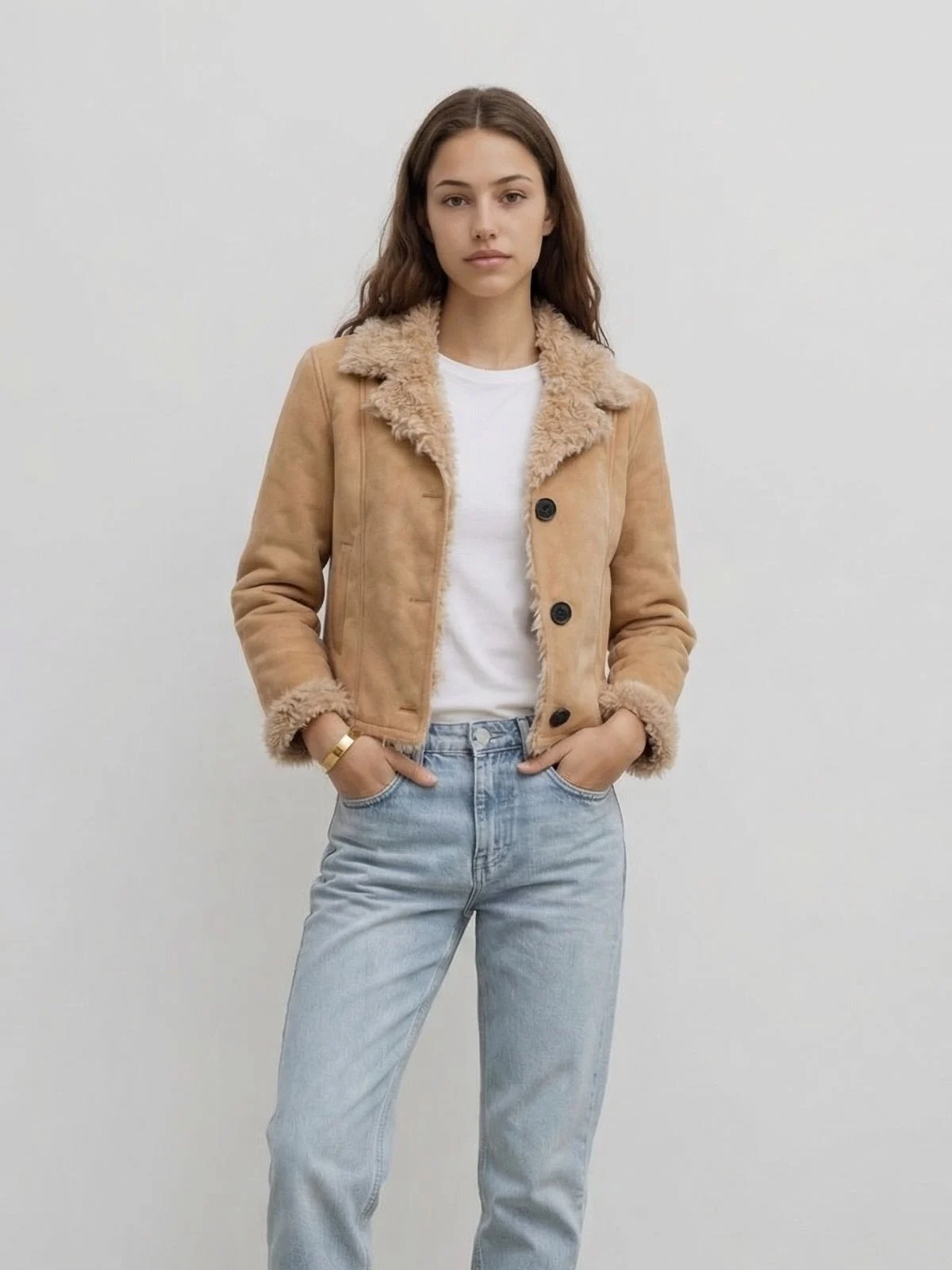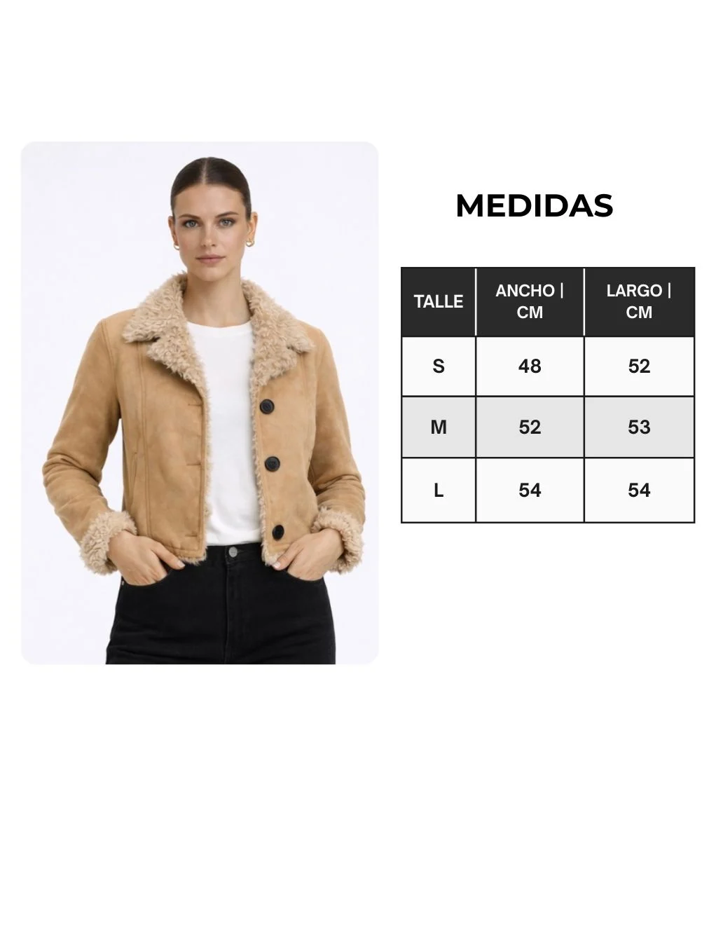 Detalle de modelo: Campera de suede (gamuzado) con piel interior. Se cierra con botones (ojal boton)