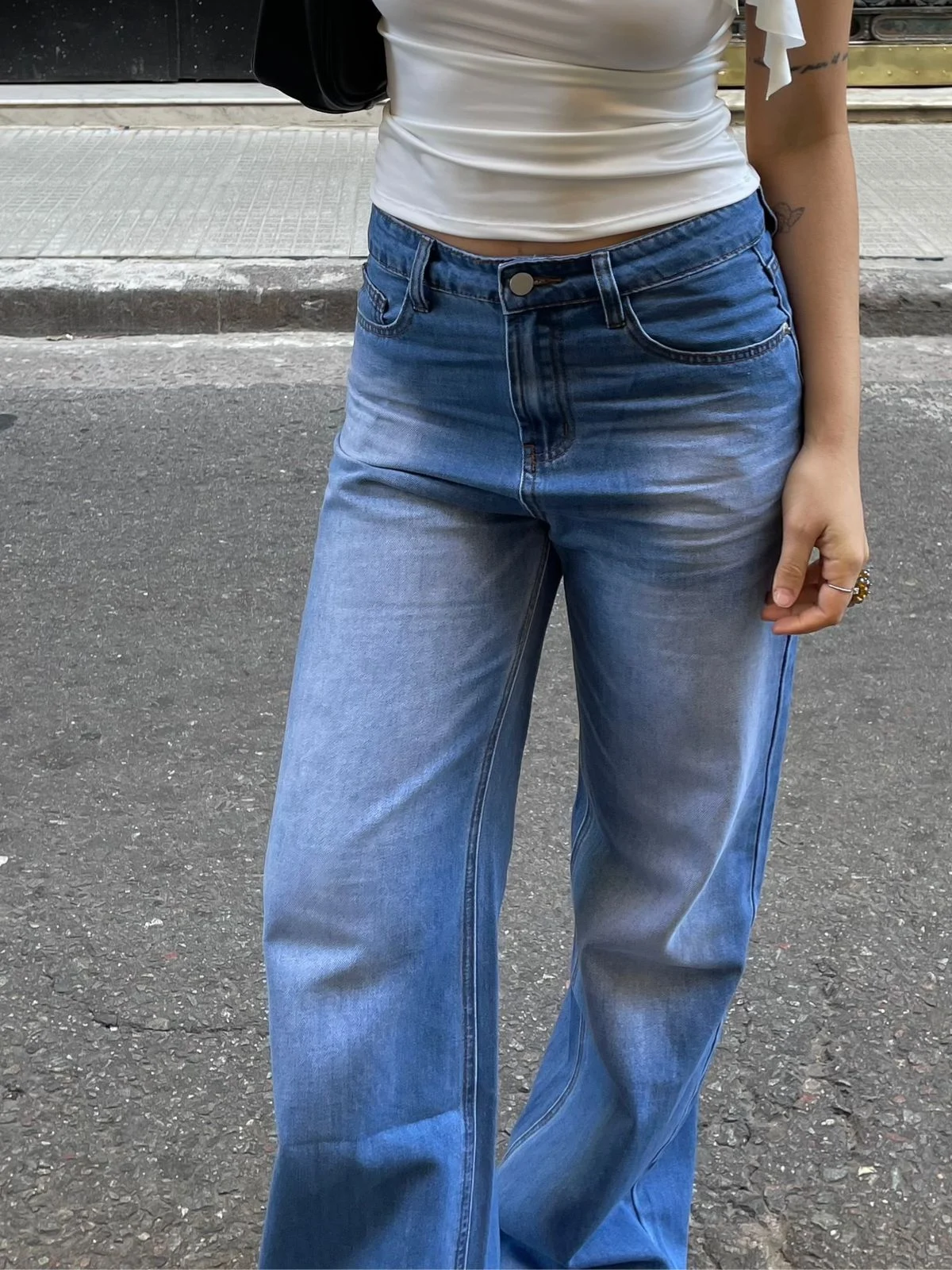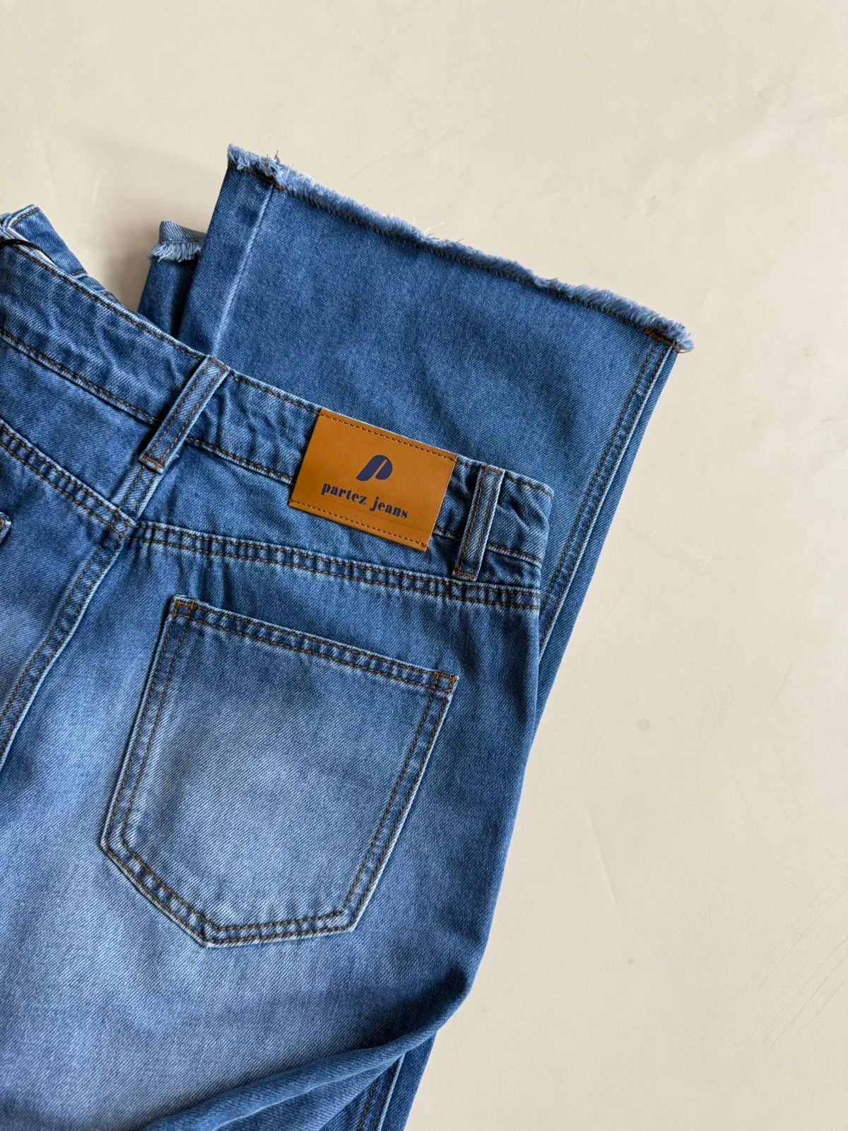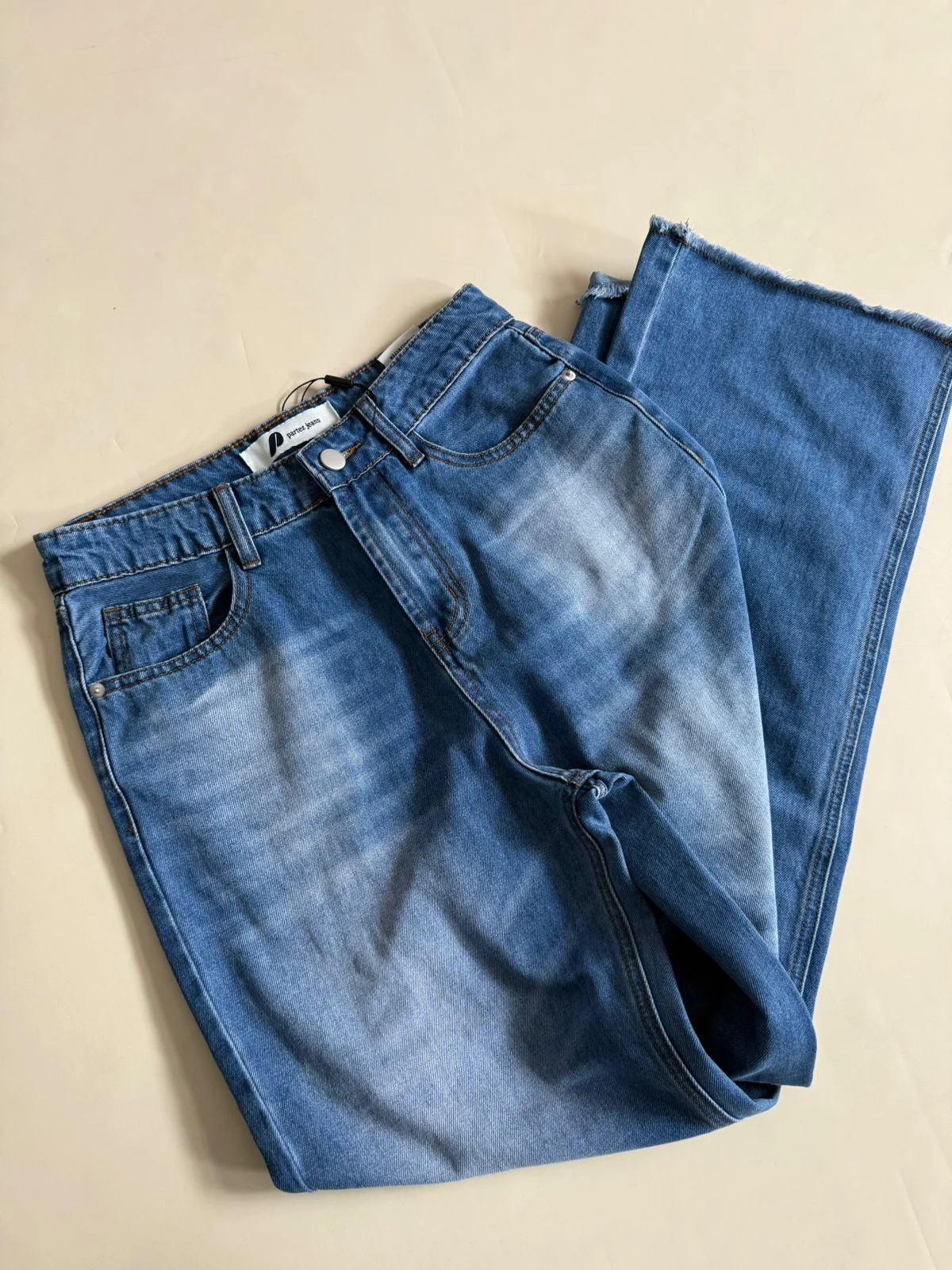 Jean tiro alto, lavado azul localizado con bigotes. Roturas en ruedo.