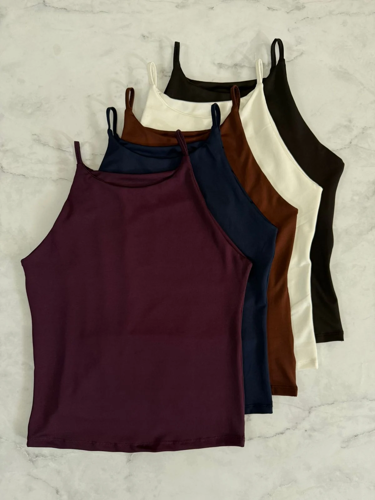 Detalle de modelo: Musculosa basica corte halter con doble tela en delantera y espalda