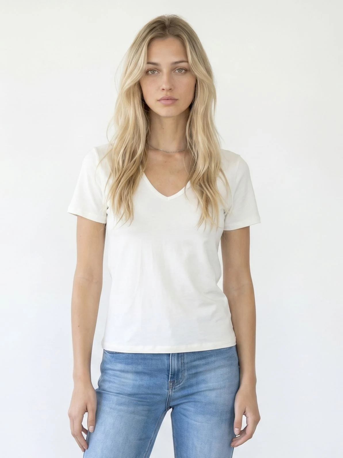 Detalle de modelo: Remera basica manga corta con cuello en V.