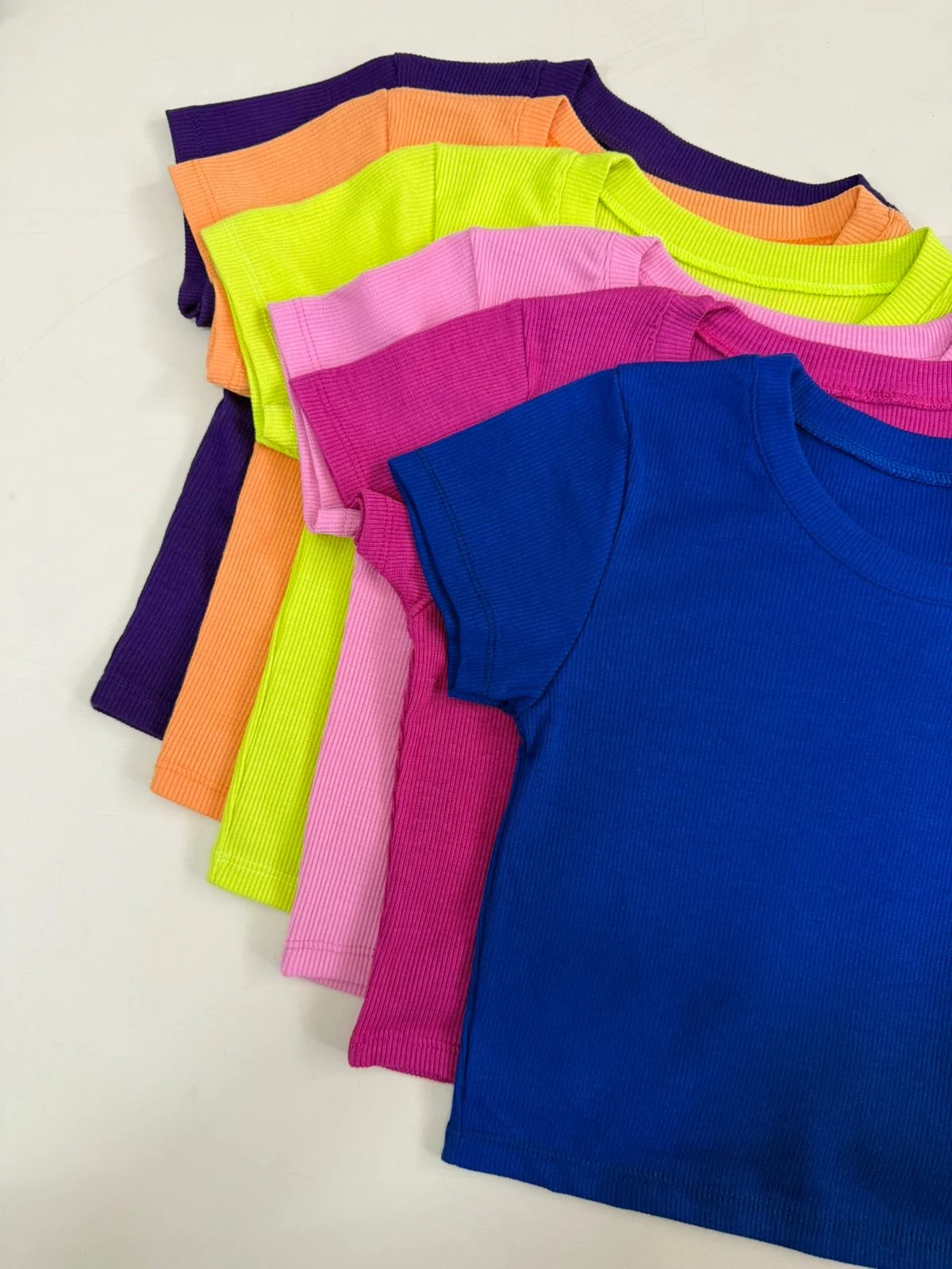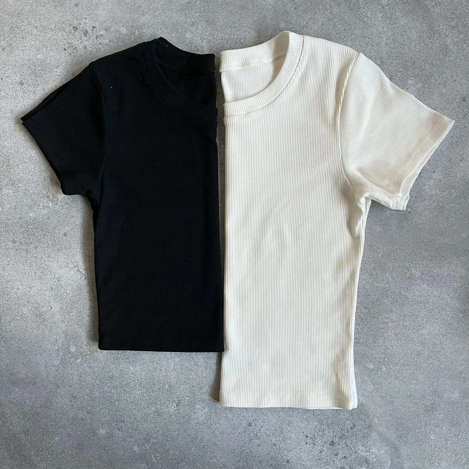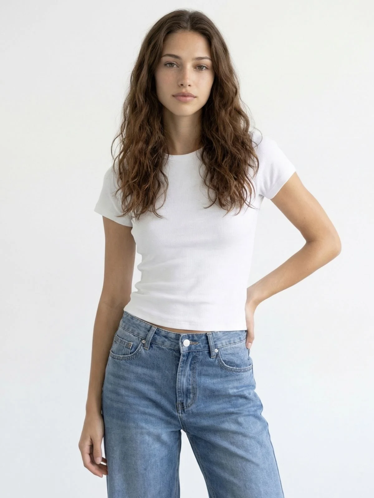 Detalle de modelo: Remera manga corta al cuerpo con cuello redondo.